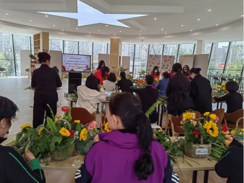 为了提升辖区妇女的创业和就业技能以及创新能力,盘江社区还结合辖区实际,特别邀请花艺师开设了以“诗情花意妇女节·巾帼花开竞芳菲”为主题的公益插花课程。这些包括“亲子插花”和“长者花艺沙龙”的课程,旨在通过插花技能培训促进不同年龄段居民之间的互动。课程优先面向“宝妈”群体,在培养她们插花技能的同时,鼓励其探索社区微经济机会,激发创业热情。截至目前,社区已先后开展12次技能培训,提供20余次就业机会,为辖区妇女开辟了一条崭新的职业发展道路。